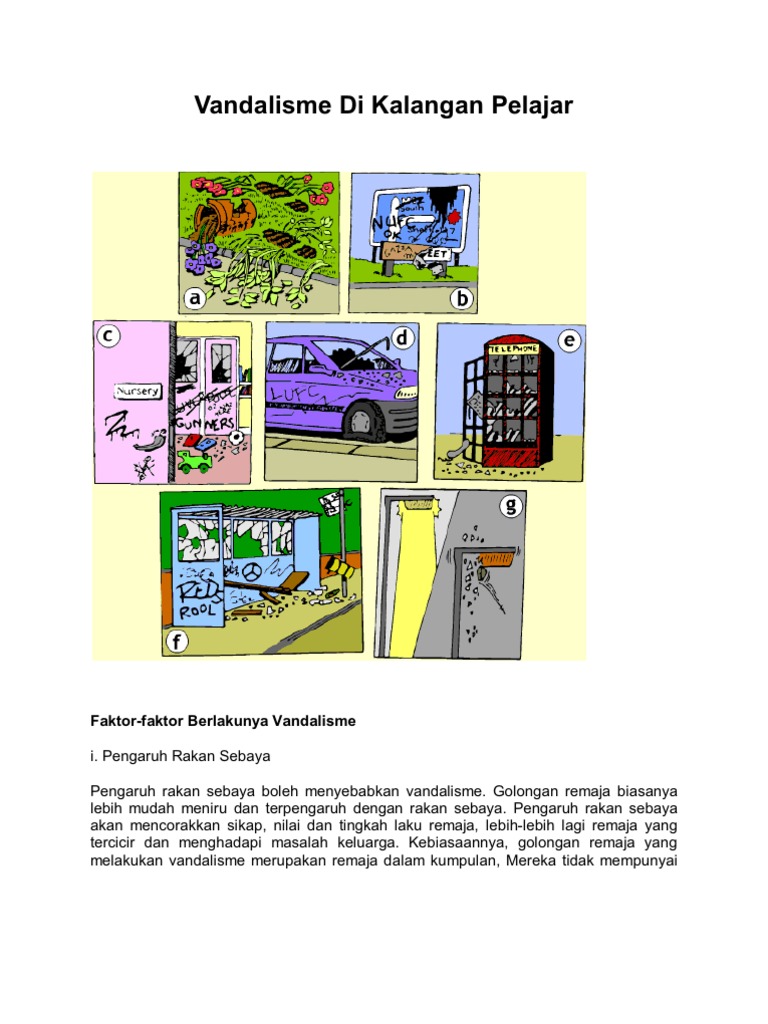 Gejala Vandalisme Faktor Menyebabkan Berlakunya Gejala Ini 1 from imgv2-2-f.scribdassets.com Seterusnya, sikap apati, individualistik dan materialistik masyarakat turut mendorong berlakunya vandalisme. Pengaruh rakan sebaya boleh menyebabkan berlakunya vandalisme. Golongan remaja biasanya lebih mudah terikut dan senang terpengaruh dengan rakan mereka. Namun, dalam realita masyarakat khususnya remaja sebagai subjek yang dibahas, belum mengamalkan pancasila sebagai dasar dan pedoman dalam kehidupannya. Jika terdapat golongan muda yang melakukan gejala sosial seperti merempit, vandalisme, dan gengsterisme. Antara punca berlakunya gejala sosial ialah masalah hal keluarga yang dihadapi dalam sebuah keluarga. Di samping itu, kekurangan didikan agama dalam kalangan ibu bapa merupakan faktor lain hal ini disebabkan pasangan muda masih berkelakuan seperti remaja dan tidak berfikir secara logik ataupun rasional. Berlakunya vendalisme ini adalah disebabkan untuk mendapatkan sesuatu, contohnya duit dari telefon awam.